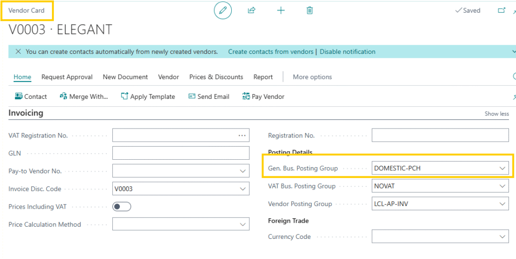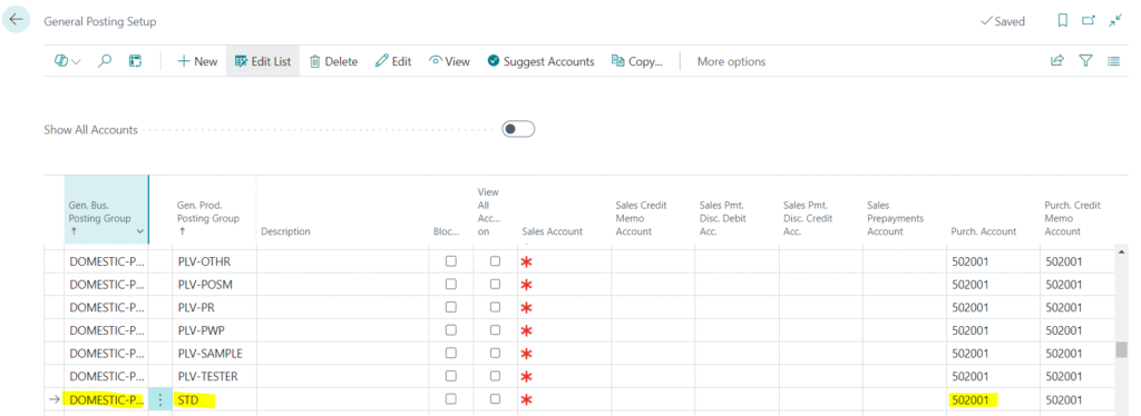 - Check the combination of Gen. Bus. Posting Group (mentioned the vendor card from whom users are purchasing items Refer to Image 8) and Gen. Prod. Posting Group and G/L account are mentioned in the Purchase Account column as highlighted in the image below