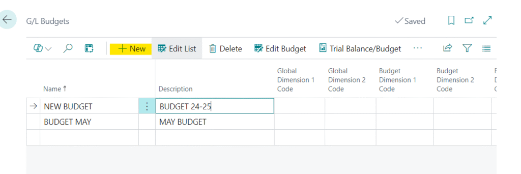 - G/L Budgets list page will appear and create a new budget by clicking on the New action Button. (Refer to Image 3)
