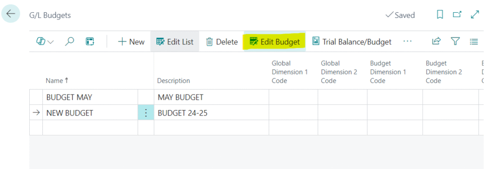 - Click on Edit Budget option for adding the amount to the G/L accounts.