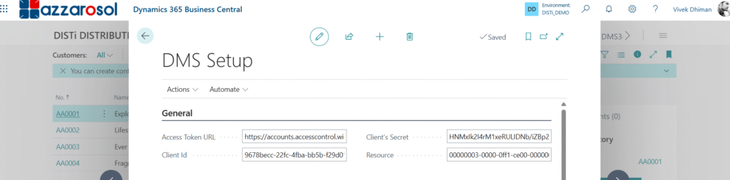 Open Business Central and search DMS setup in the search bar